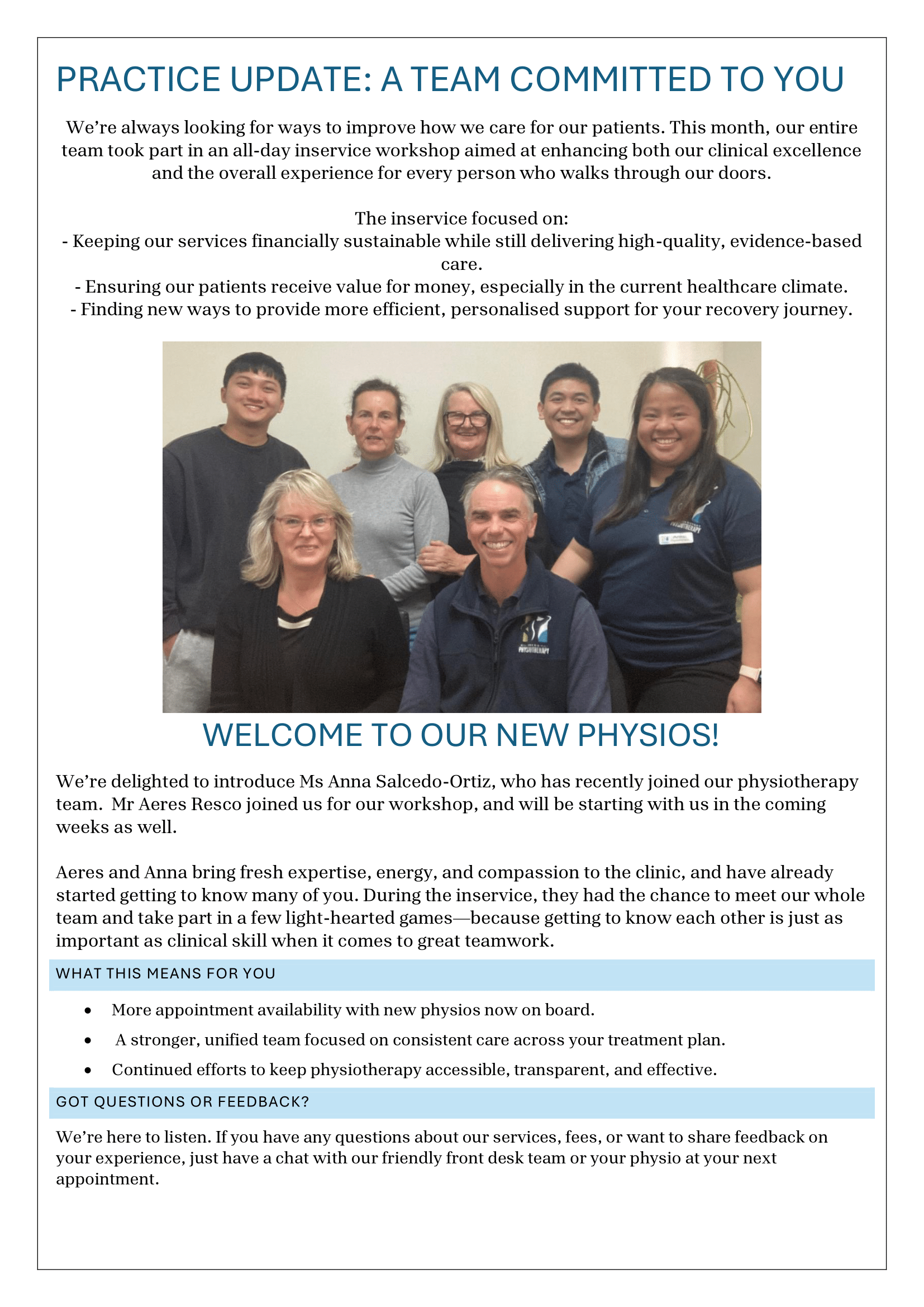 Our friendly Physio and admin team are happy to help you with any enquiries you have, and to organise your appointment/s.